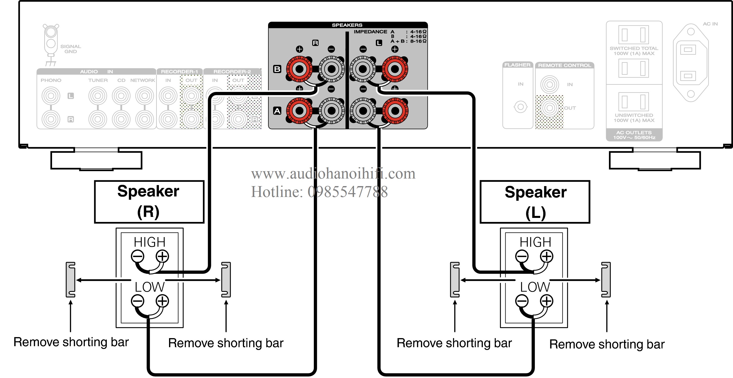 Đánh giá ở mức 40 watt cho mỗi kênh vào 8 ohms và 55 watt cho mỗi kênh vào 4 ohms, các đặc tính ampli nghe nhạc 2 kênh marantz A và loa B kết quả đầu ra, cho 2 bộ loa stereo, hoặc cho bi-dây với loa stereo phù hợp .